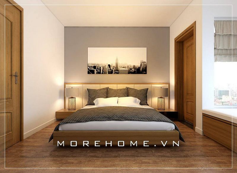 Giường ngủ chung cư hiện đại với chất liệu gỗ công nghiệp nhẹ nhàng, thanh thoát tạo nên một không gian phòng ngủ đầy sang trọng và tiện nghi
