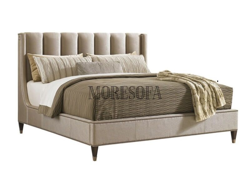 Giường ngủ chung cư bọc da màu xám be đầy tinh tế, đầu giường thiết kế lớn cách điệu mang lại cảm giác thoải mái và sang trọng hơn cho trong quá trình sử dụng