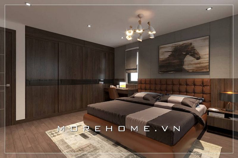 Giường ngủ 2 người bọc da cao cấp, gam màu nâu chủ đạo vừa mang lại cảm giác ấm áp, thoải mái, vừa tạo nên sự sang trọng cho căn phòng