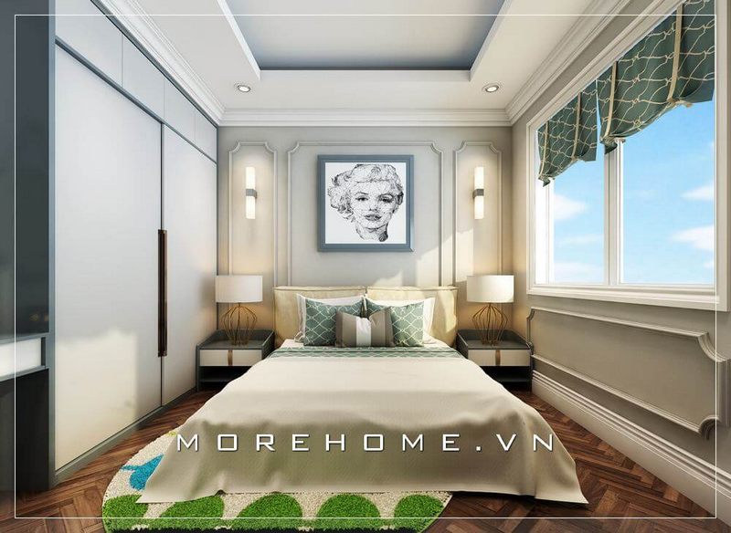 Giường ngủ màu trắng tinh tế được bố trí chính giữa căn phòng ngủ mang lại cảm giác thuận tiện và cân bằng hơn cho không gian nghỉ ngơi của gia chủ