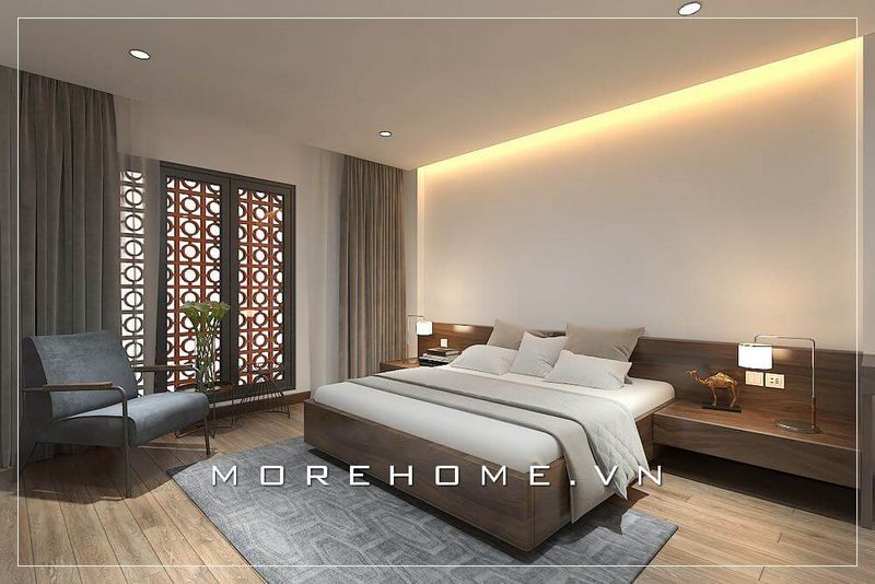 Giường ngủ gỗ công nghiệp hiện đại với tone màu nâu trầm được coi là điểm nhấn ấn tượng ở không gian phòng ngủ