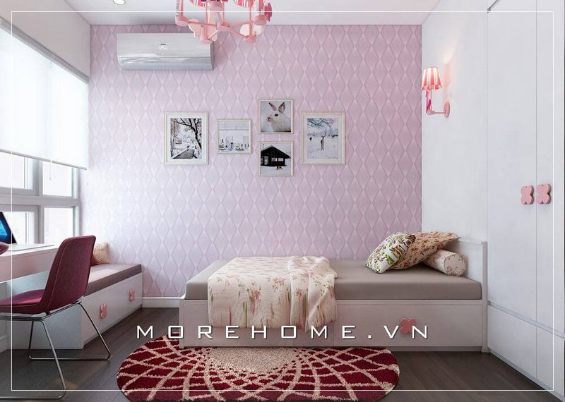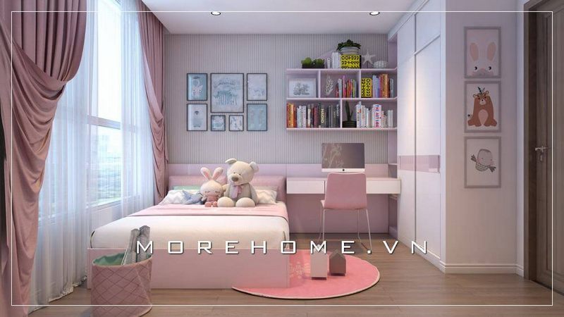 Mẫu giường ngủ gỗ công nghiệp hiện đại màu hồng dễ thương, xinh xắn cho phòng ngủ bé gái