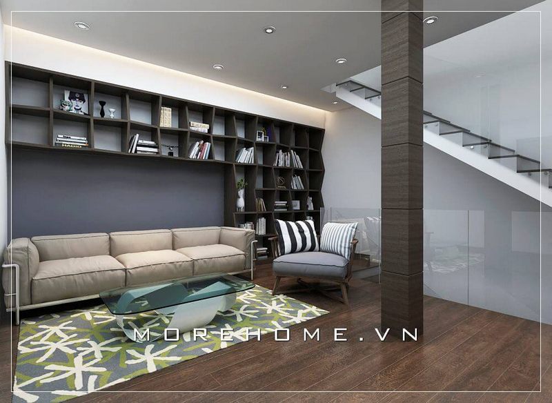 kệ sách liền ngay phòng khách được thiết kế hiện đại từ chất liệu gỗ óc chó cao cấp sử dụng như một vách ngăn tiện lợi, sáng tạo của biệt thự, nhà phố