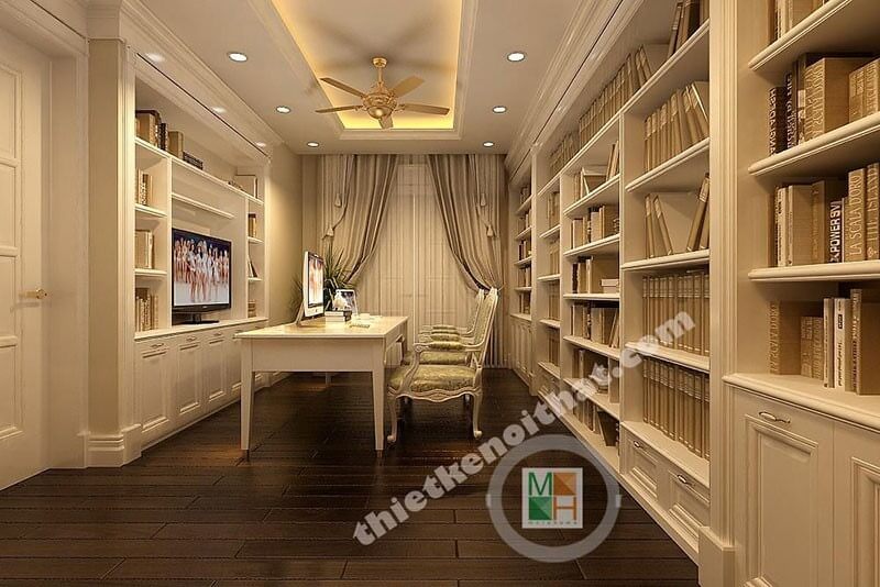 Mẫu kệ sách gỗ màu trắng trong phòng làm việc
