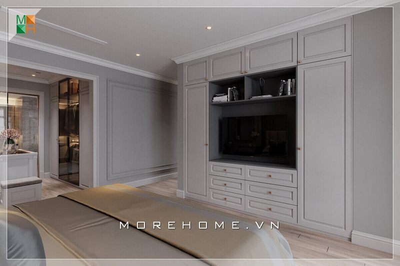 Thiết kế sử dụng tủ đồ kết hợp kệ tivi âm tường sáng tạo, hiện đại rất tiện nghi cho phòng ngủ chung cư, nhà phố.