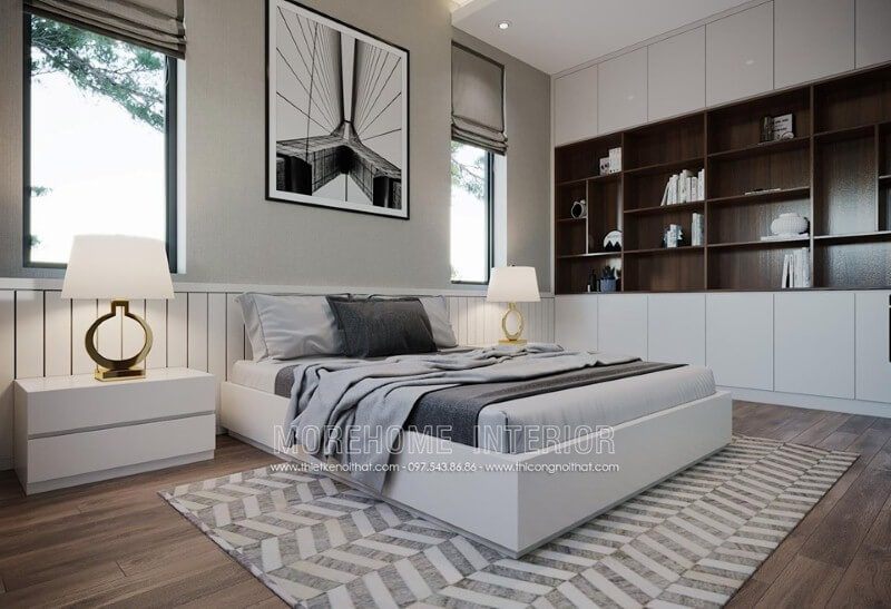 trong phòng ngủ bằng cách trang trí nội thất theo phong cách hiện đại với gam màu trắng làm chủ đạo.