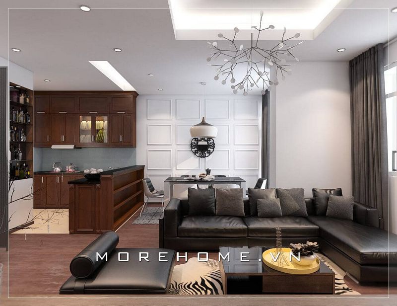 . Không gian phòng bếp của chung cư được thiết kế theo phong cách hiện đại, nội thất gỗ tự nhiên với màu nâu tinh tế, ấm áp và sang trọng.