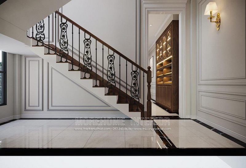 Mẫu cầu thang gỗ óc chó với sắt được xoay 180 độ và các chi tiết lan can uốn để tạo nên một hình dáng đẹp mắt và sang trọng.
